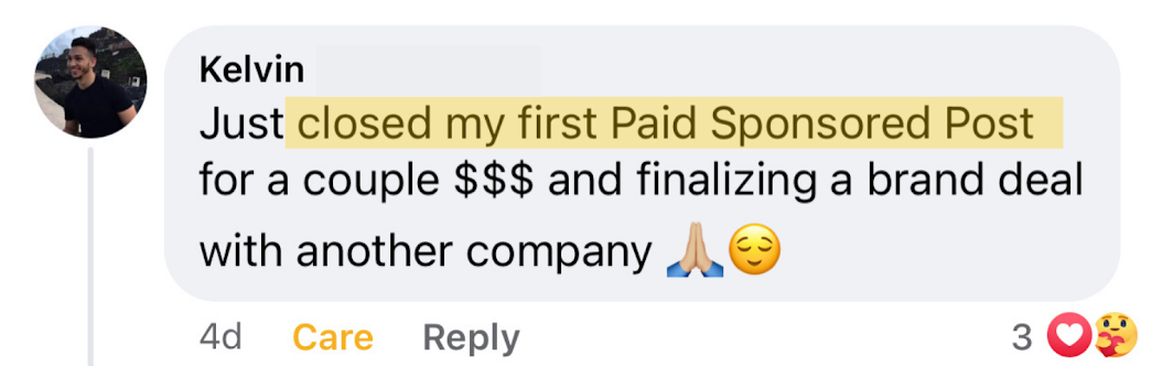 "One week after I finished the entire course I was able to close my first two brand deals. I literally made three times the money that I had invested in the course."